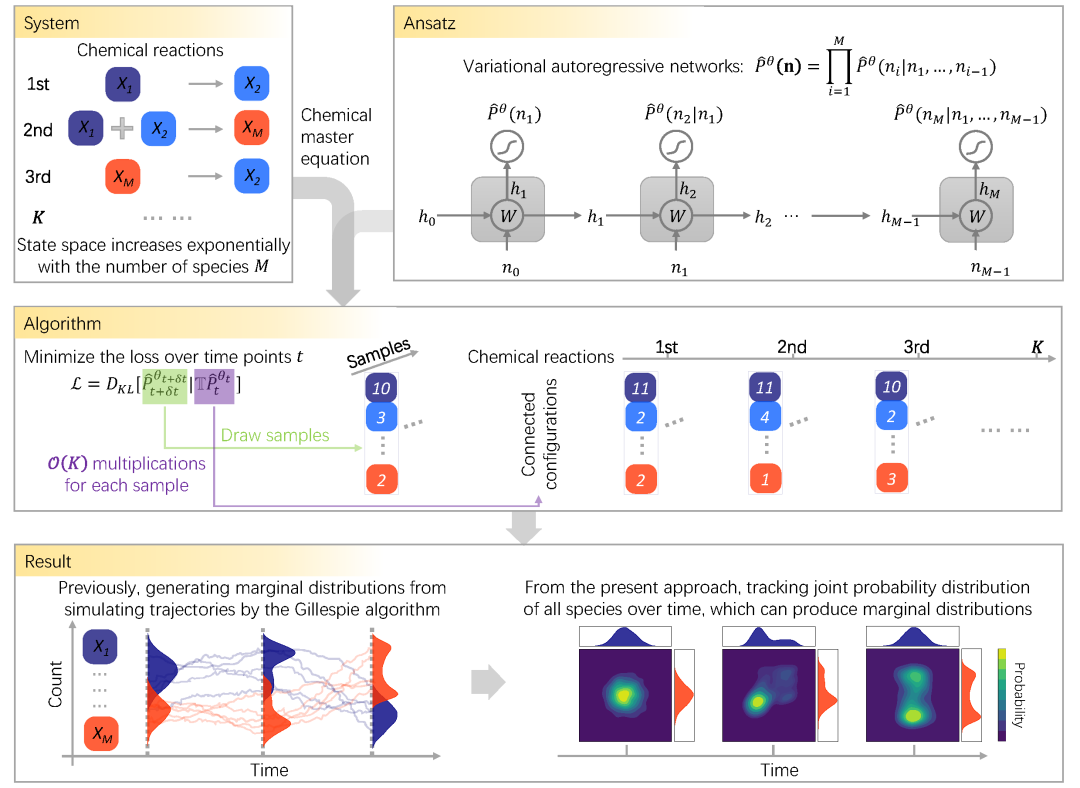 近日,中科院理论物理所彭桓武青年访问科学家、北京师范大学复杂系统国际科学中心的汤迎副研究员和学生翁佳钰与中国科学院理论物理研究所的张潘研究员合作,在Nature Machine Intelligence发表论文“Neural-network solutions to stochastic reaction networks”,提出了使用变分自回归网络来求解化学主方程的机器学习方法,提出用变分自回归神经网络(VAN)[1] 来研究随机反应网络中物种分子数的联合概率分布,刻画联合分布演化并求解化学主方程(图 1)。VAN是张潘研究员与合作者于2019年提出的神经网络变分方法,能够对统计物理微观构型进行有效采样,并计算不同构型的归一化概率,已被应用于统计物理学、量子多体系统、开放量子系统、量子电路和计算生物学。这项工作扩展了VAN以表征随机反应网络中物种分子数的联合概率分布。作为VAN的神经网络单元,作者采用了递归神经网络(RNN)和Transformer架构,它们可以灵活地表示高维概率分布并灵活调整物种分子数的上限。拓展的VAN也允许对每个物种添加物种分子数上限的约束,或者维持某些系统中物种分子总数守恒的约束,这都可以收缩概率空间以提高计算的准确性。新方法采用强化学习框架中的策略梯度算法训练自回归网络,不需要使用其他方法先验模拟的任何数据,给出了一个自动归一化分布作为任意有限时间内化学主方程的解,得到随时间演化的联合分布,提供了高维状态空间中每种构型在不同时刻的概率。此外,此方法在表示多峰分布方面表现出可塑性,对于物种分子数守恒的系统,具有随时间变化的反应速率的系统和高维系统均是非常有效的。