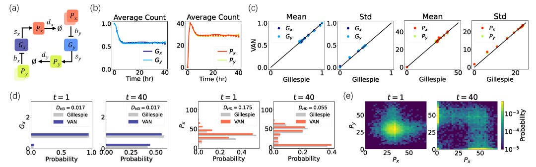图2:基因切换开关的结果。(a) 随机反应网络的示意图。(b)由VAN(点)和Gillespie算法(线)得到的基因和蛋白质的平均分子数随时间的演化。(c)比较VAN和Gillespie模拟在时间点t = 0,1,…,40的基因和蛋白质的均值和标准差。(d)Gillespie模拟(灰色)和VAN的边缘分布。图例中包含两个分布之间的Hellinger距离。(e)由VAN得到的两种蛋白质在时间点t = 1,40的联合分布,颜色表示了对数尺度上的概率值。