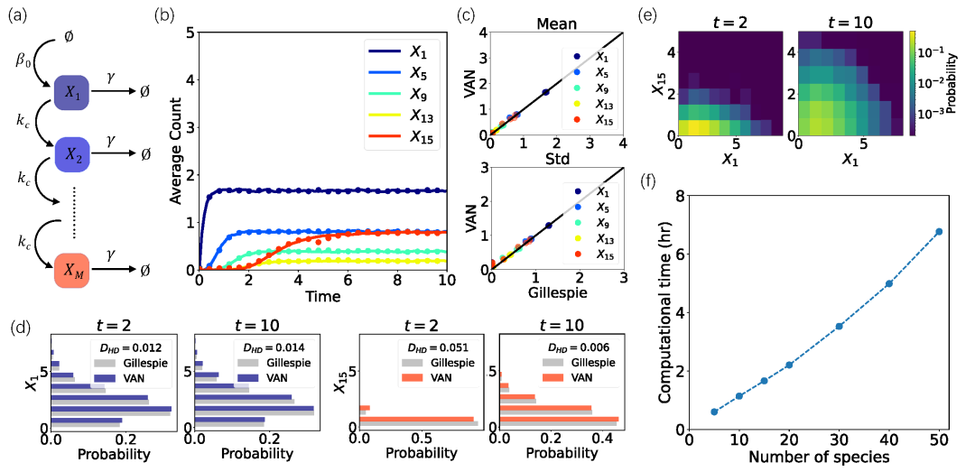 图3:细胞内信号级联反应的结果。(a)随机反应网络的示意图。(b)由VAN(点)和Gillespie算法(线)得到的基因和蛋白质的平均分子数随时间的演化。不同颜色表示不同物种种类。(c)在时间点t=1,2,…,10,VAN和Gillespie模拟之间物种分子数的平均值和标准差的比较。(d)Gillespie模拟(灰色)和VAN的边缘分布。图例中包含两个分布之间的Hellinger距离。(e)第一个物种和最后一个物种在VAN时间点t = 2,10的联合概率分布,颜色表示概率值。(f)物种种类数不同的系统的计算时间,可以发现计算时间尺度几乎与物种的种类数成线性关系,对于高维系统有高效的计算效率。
