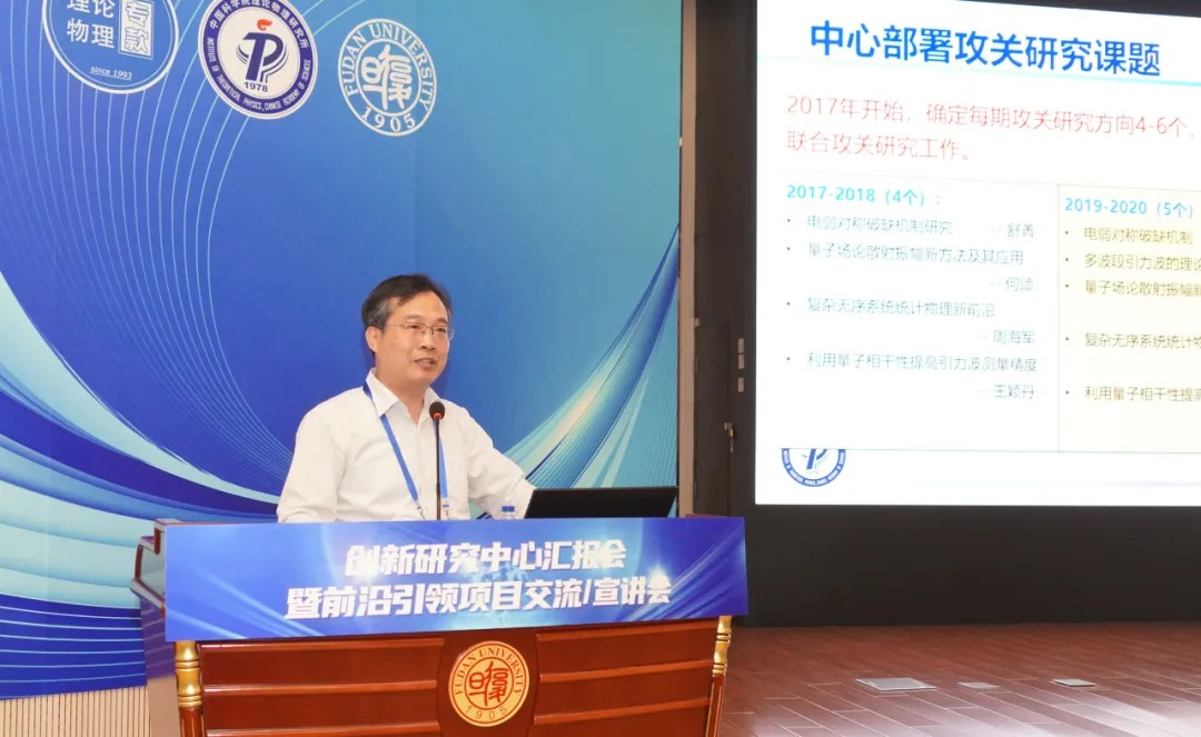 “创新研究中心汇报会”由蔡荣根院士主持并致辞。他介绍道,自2017年起,理论物理专款分批部署了6个创新研究中心项目。为进一步促进创新研究中心发挥高端交流平台作用,并促进各中心之间的交流,学术领导小组组织了本次会议,并安排了最早设立的2个中心项目汇报工作。他希望各中心项目负责人加强交流、相互学习、相互促进,共同把创新研究中心这一平台建设成为全国理论物理科学研究与学术交流的高地。