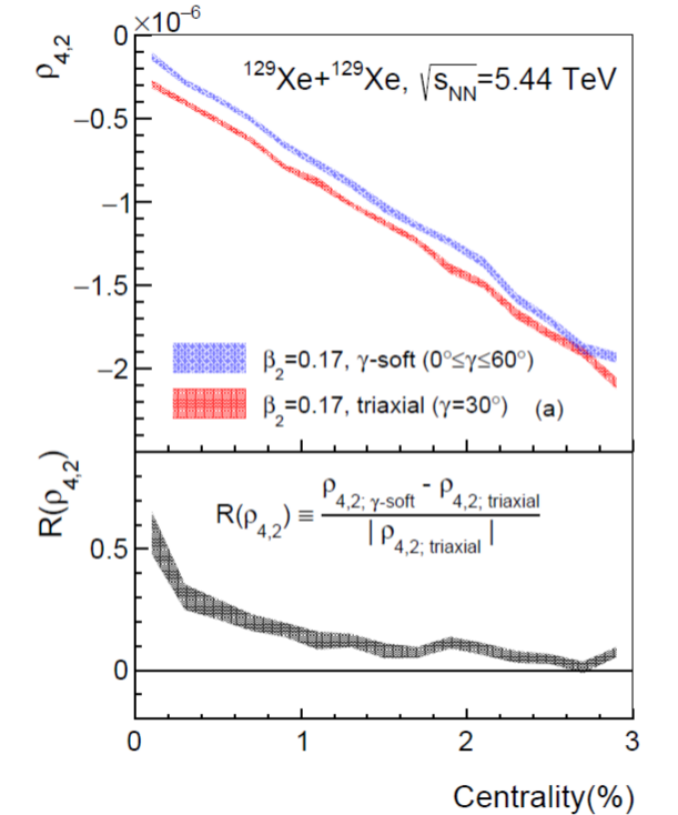 在LHC能区,由于核-核碰撞的时间极短(小于10-24秒),原子核基态结构的空间信息被直接刻画于QGP的初态,并在演化过程中转化为末态粒子的动量分布和关联。得益于相对论流体力学及耦合模型对QGP演化的精细描述,研究者可从不同末态流信号中提取QGP初态及所碰原子核的结构信息。利用iEBE-VISHNU耦合模型,北大团队及合作者系统计算了 129Xe+129Xe碰撞椭圆流与横动量关联等观测量,并预言ρ4,2等6粒子关联对二级形状相变ϒ 软行为敏感。该研究工作为探究原子核形状相变提供了全新的途径和方法,也拓展了高能核-核碰撞领域相变和相变临界点研究的版图。