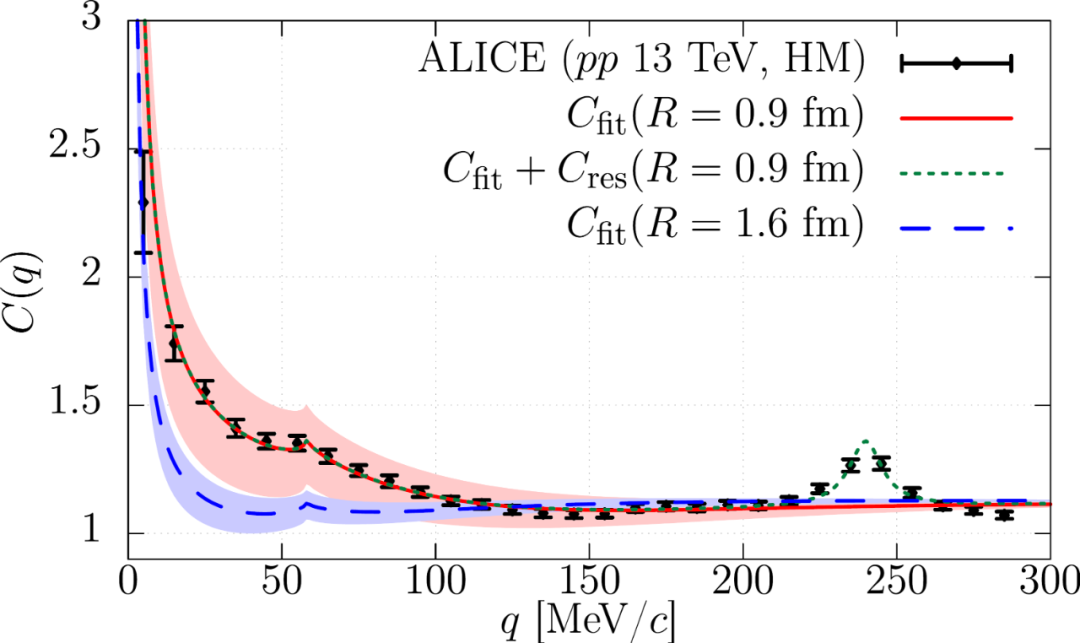 理论物理所博士后神谷有辉(Yuki Kamiya)及其合作者从强子关联函数出发研究相互作用取得了重要成果,首次提出了包含耦合道效应、库伦效应以及同位旋破坏效应的分析方案。由于系统与和的耦合很强,的对关联也受到产生和对的强子源的影响(参见图1)。神谷有辉等利用相互作用的耦合道手征SU(3)模型[K.Miyahara et al., PRC 98 025201 (2018)]并将其扩展用以描述强子对关联,完美地描述了ALICE实验的相关数据(见图2)。这一结果说明在耦合道效应在关联函数的处理中是至关重要的。这项工作提出的理论方案可广泛应用于高能核对撞中其他强子-强子对关联的研究。